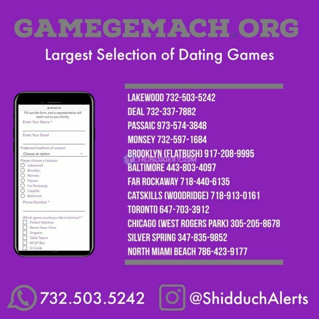 Are you dating and looking for a game? Try our games gemach. Visit GameGemach.org or Contact 732-503-5242.